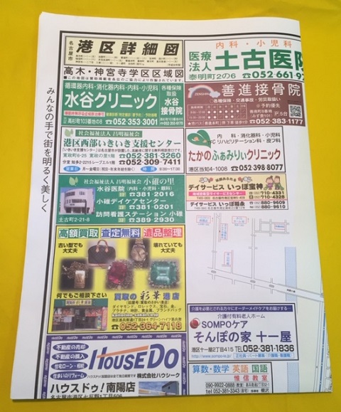 お店がある学区の詳細図の8つ折りの正面に来るように掲載して頂きました。普通のチラシではないので、自分の家でも保管しております。中々宣伝効果を期待しても手元に残るには何が良いのか、なにが上手くいったかは分らないですよね。まぁ納得のいく宣伝が1件は出来たと感じます。