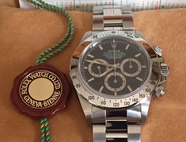 ロレックス、デイトナ型番16520黒文字盤の買取がありました。ご存知のエルプリメロですね。ここ1年くらいでの高騰ぶりは怖いくらいですね。こういったプレミアム商品は程度によって金額差がかなり出て来ます。特にギャラ所謂保証書ですね。ロレックスの買取にはこの保証書があるかないかで数万円違ってきます。高額になれば成る程あった方が良いです。また発売当時の箱やカレンダーなど付属品もあると査定額に反映されます。また、傷が有るから磨いていくと良いとお考えの方はブッブーです。どこのお店の方も10〜20倍のルーペで確認しますので、直ぐに分かってしまいます。