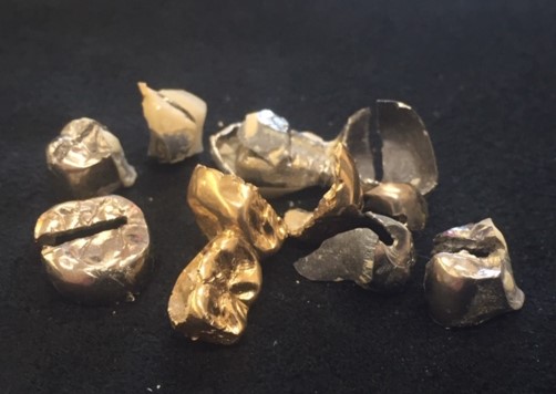 金歯には刻印はありませんので、試金石で確認をさせて頂き 色目を見てK18若しくはそれ以下の品位での買取となります。