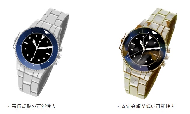 画像を比較してみると 一目瞭然ですよね。同じ時計なら 左の物が金額は高いです。